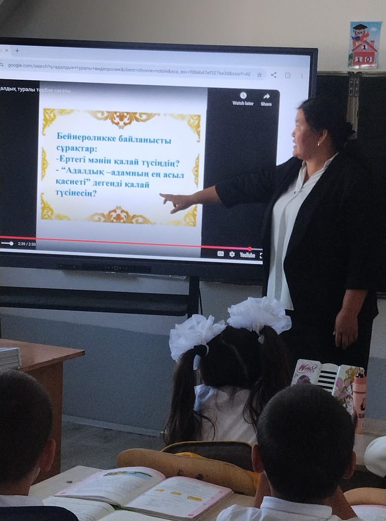 Түркістан облысы, Шардара қаласы, аудандық білім бөліміне қарасты Б. Соқпақбаев атындағы жалпы білім беретін мектебінің қосымша білім беру педагогы А. Жумабекова "Адалдық парасаттылық-адамзаттың белгісі" тақырыбында 3-6 сынып арасында сынып сағат өтті. Мақсаты: Жас ұрпақты ң санасына адал жолмен еңбек ету керектігін, үлкенге құрмет, кішіге ізет көрсету керектігін ұғындыру. Оқушылардың бойына адамгершілік қасиетін ұялату үшін мейірімді, қамқор болуға ықпал ету.