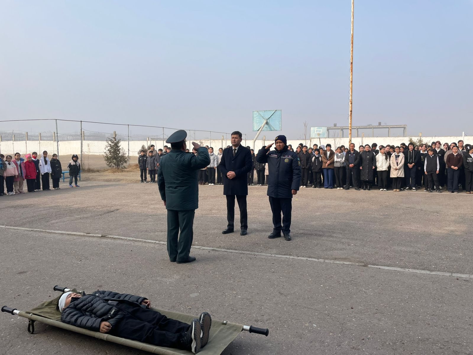 Жаттығу барысында штаб бастығы мектеп директоры Н. Сариев оқушыларға өрт қауіпсіздігі ережелерін сақтау маңыздылығын айтып, өз тәжірибесімен бөлісті және қауіпсіздікке жауапкершілікпен қарауға шақырды.Жаттығуға өрт сөндіру қызметкерлері мен жедел жәрдем қызметі келіп қатысып, оқушыларға өрт кезінде дұрыс әрекет ету, қауіпсіз эвакуациялау, алғашқы медициналық көмек көрсету жөнінде түсіндірме жұмыстарын жүргізді.