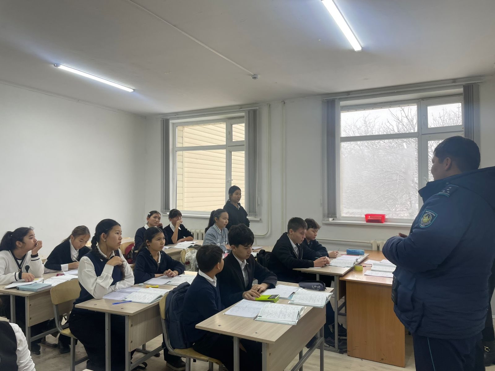 Кездесу барысында жасөспірімдердің құқықтары мен міндеттері, заң алдындағы жауапкершілігі, тәртіп сақтау және салауатты өмір салтын ұстанудың маңыздылығы кеңінен айтылды. Сонымен қатар, оқушылар тарапынан қойылған сұрақтарға нақты жауаптар беріліп, қауіпсіздік ережелерін сақтау қажеттілігі ерекше атап өтілді.