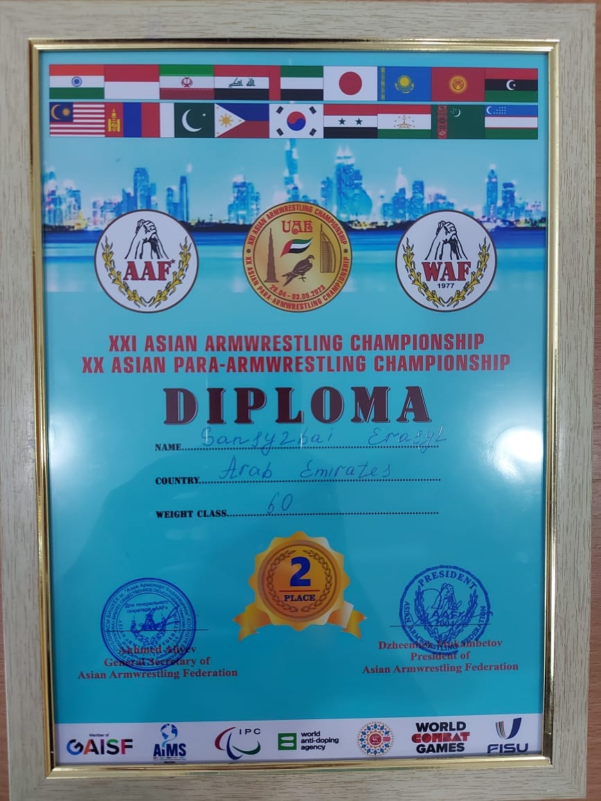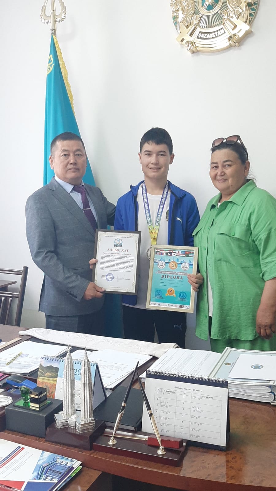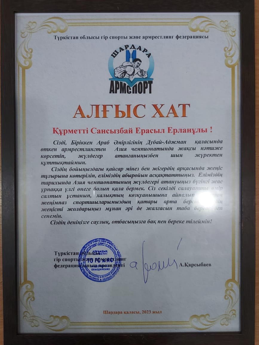 Біріккен Араб Әмірлігінің Дубай-Аджман қаласында Армрестлингтен 29.04 - 03. 05. 2023ж. күндері аралығында XXI Азия чемпионатына қатысып, Қазақстан ұлттық құрамасы қатарында сайысқан мектебіміздің мақташы, 9 "Ә" сынып оқушысы Сансызбай Ерасыл Ерланұлын күтіп алу сәтінен.